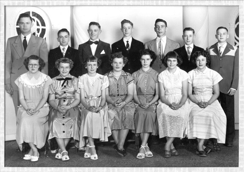 Sources: Photo and program contributed by Robert Schieber. The Girl that is in the 2nd row from the bottom and the 4th in from the right is Arlene Mae Vogt daugher of Edward John Vogt and Teresa (Bakazan) Vogt. Can anyone supply names of more of the students?