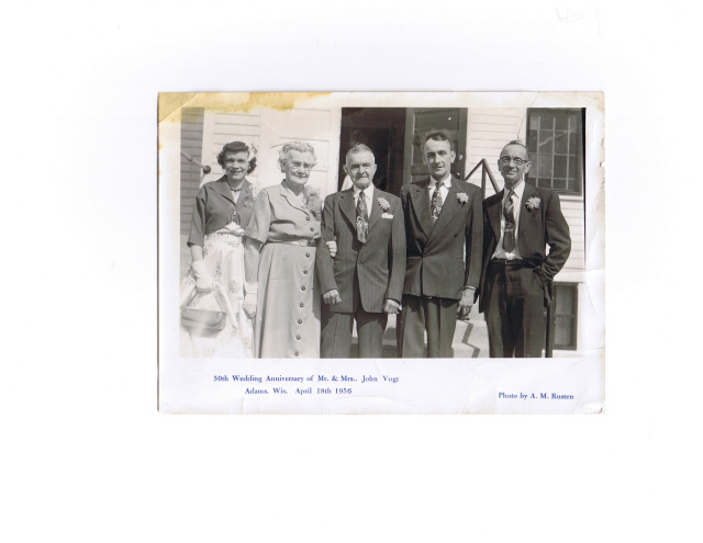 Source & Description: Picture of John Edward Vogt and Laura Delaney (Atchey)Vogt's 50th wedding anniversary on April 18, 1956 in Adams. The lady to the left of this couple is their daughter Gladys (Vogt) Faulkner, to the right of the couple are their sons Leroy Vogt and Edward John Vogt. Contributed by Robert Schieber
