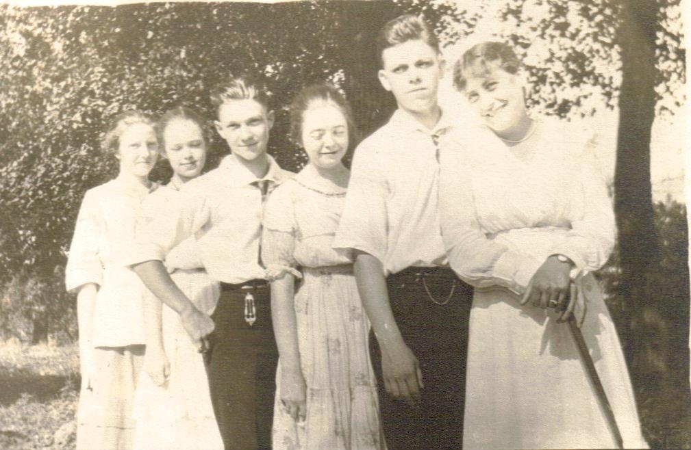The Wilson family of Springville from left to right back row: Henry Robert born 6 Nov 1895, Fannie Frances born 17 Oct 1892, William Walter born 19 Sept 1890, Alice Mary born 30 May 1886 front row:Emma Raud born 20 Sept 1903, Frances Angelia born 3 June 1858, Oliver
