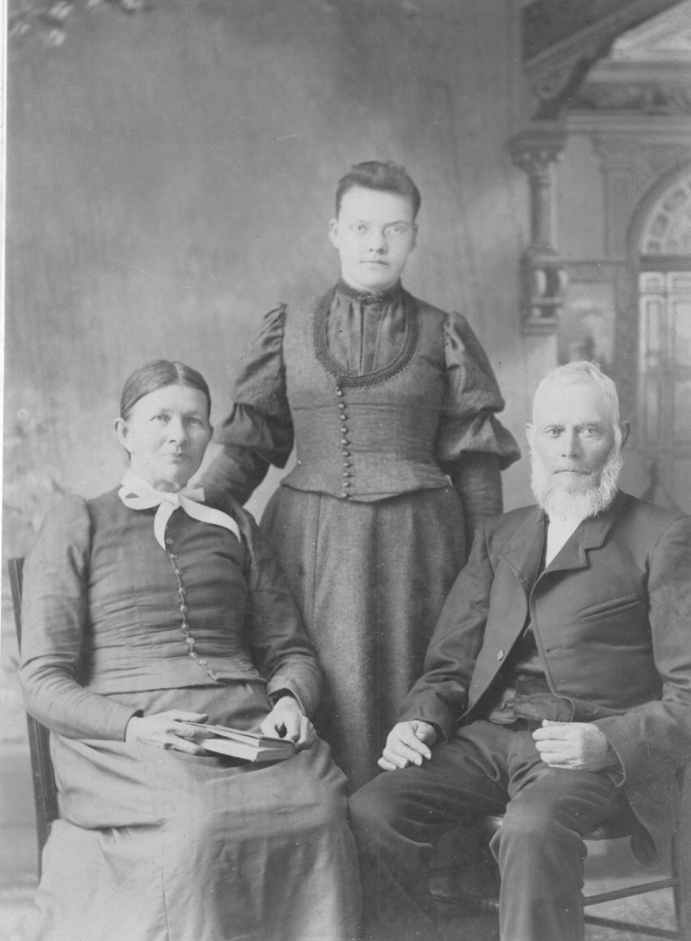 The Sheldon family of Easton from left to right: Lydia Margaret Sheldon (nee Becker) born 28 Apr 1837 Pillar Point NY, Altha May Sheldon born 7 May 1874, Talmadge Sheldon born 29 Dec 1814 Warren Co NY. Talmadge was the son of Seneca Sheldon. He migrated from New York to Adams County, Wisconsin. His first wife was Betsy Tefft. Lydia was the daughter of Adam and Hannah (nee Van Patten) Becker. She married first David Spencer., second Cephas Brown 30 May 1858 and lastly Talmadge Sheldon 12 Sept 1871 in Adams County. Talmadge and Lydia settled in Emerson, Michigan in the 1870's. They are buried in Ridgelawn Cemetery, Breckenridge, Gratiot County Michigan. Photo contributed by Donna Wilson.