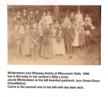 Source & Description: Picture of presumably the Shipway or Wintersteen farm ca 1890's. The man holding the hand of the little girl (Ina, my grandmother) is my great grandfather-Charles Shipway. The children are his. From right to left: Ina, Art, Blanche, Dick, Rollins (?) The children's mother's maiden name was Ella Wintersteen, daughter of Jacob and Ann (Moore) Wintersteen. I believe the photographer was George Oakes. Photo contributed by PJ Burnsky. PJ also shared a picture taken at the Dells of the Shipway's and Wintersteens