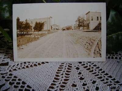 Source & Description: A real photo postcard submitted by an anonymous donor, postmarked 1913. Looking south on Main Street about 1913, in Adams, Wisconsin. Note the horses and wagon, and unpaved street.