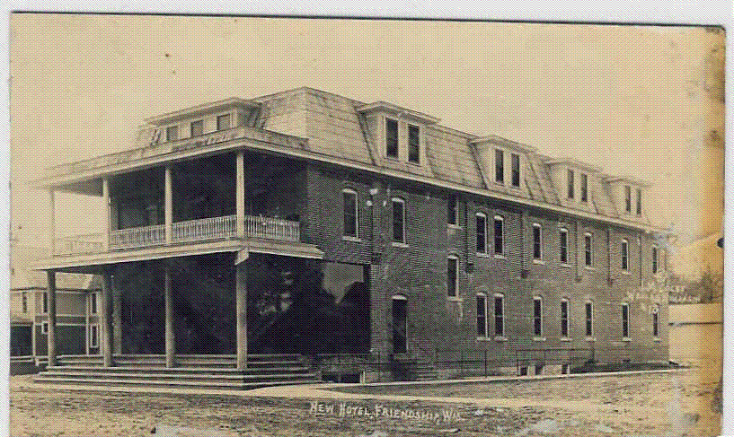 Source & Description: An antique postcard from my collection, of the Friendship Hotel within a short time after it was built in 1912. This building is now being restored by new owners Ed & Gail Carlson, who have plans for a bed & breakfast theme inn with a family-style restaurant and old-fashioned saloon. It's still called the Hotel Friendship [(608) 339 2899]. It's on main street right across from the courthouse.
