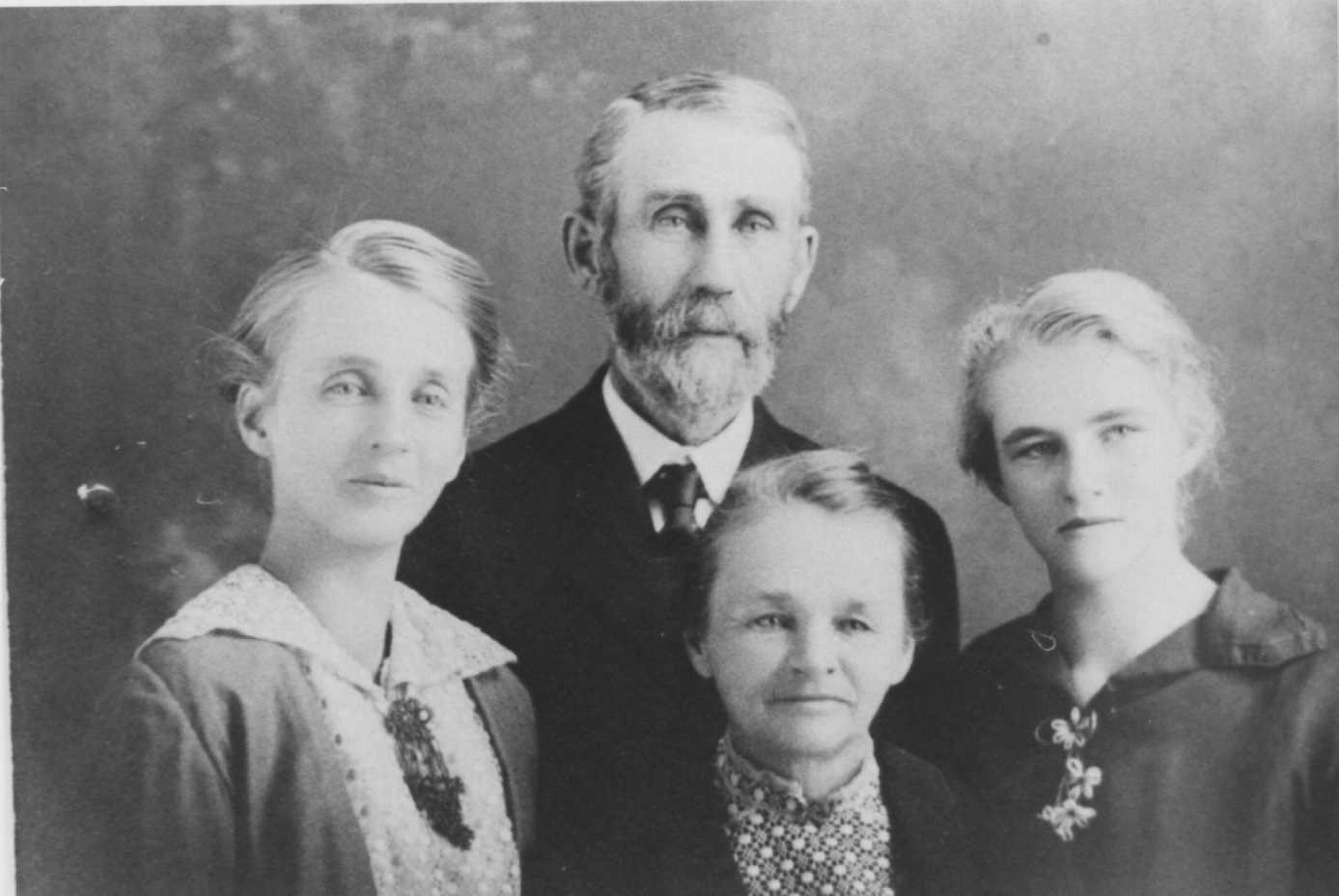 The Ezra Frost Family of Easton left to right Phoebe born 1885, Ezra born 11 July 1853 Sugar Creek Walworth Co WI., Elsie (nee Olmstead) born 9 Aug 1861 Easton WI., Blanche born 20 Mar 1900 Easton WI. Ezra was the son of Alonzo and Elvira (nee DeWolf) Frost who came from Ontario Co NY. They settled in Easton about 1858. Elsie was the daughter of Darius and Adeliza (nee Sheldon) Olmstead. Phoebe was a teacher who never married. Blanche married William Walter Wilson of Springville. They moved to a farm in Easton when a tornado destroyed the farm in Springville about 1928. All are buried in the Easton Cemetery. Photo contributed by Donna Wilson.
