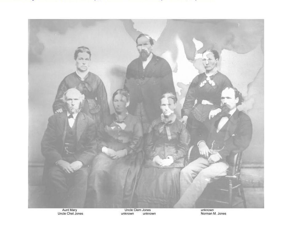 Source & Description: Contributed by Dawn Olson. Photo probably taken in 1870's, of Chester Jones, Clement Jones and Norman M. Jones. Chester and Clement are sons of Asa K. Jones and Mercy Streeter. Asa K. Jones is buried in Jackson, Adams, Wisconsin as is his wife Mercy. Chester Jones was born March 21, 1823 in Rockingham, Windham Co., VT. He married (1) Olive E. Williams March 11, 1848. Their son (shown in the photo) is: Normon M. Jones b. May 26, 1849, Wisconsin. The woman called Aunt Mary is Chester's second wife. Chester Jones married Mary Elizabeth Spaulding, March 15, 1853 in New Hampshire. She was born February 08, 1830. Their child is: Cora Elizabeth Jones, b. March 14, 1865, Wisconsin. Clement Jones was born July 29, 1826 in Rockingham, Windham Co., VT. He married Mary A. Calkins June 17, 1867 in Adams County, Wisconsin. [See Adams Co Pre-1907 Marriages on this site, Vol. 1, P 114]. Clement Jones lived in New Chester, Adams Co., Wisconsin in the 1860 census. Chester in lived in Jackson, Adams Co. Wisconsin as of the 1870 census (post office was Friendship). Norman M. Jones lived in Jackson, Adams Co. Wisconsin as of the 1880 census.