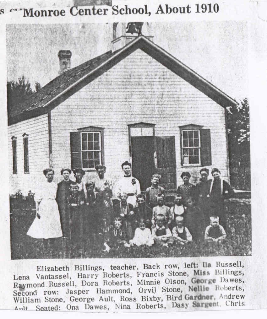Source & Description: Contributed by Willes Traver from his grandmother's (Ethel Viola Burr) scrapbook from an unknown newspaper, possibly the Adams/Friendship paper, of the Monroe Center School, about 1910. Ethel Viola Burr was the daughter of Elmer Burr & Mabel Freiday (Friday, Freday, Frieday). She lived most of her life in Adams County, in the Grand Marsh, New Chester, and Big Flats Areas. She was married to Robert J Cleland Nov 11, 1919 in Adams County. They had three children, Katherine Mae( My mother), Tressa, and May Cleland who died during childbirth. She separated from Robert J Cleland and later developed a relationship with Lester Wade and stayed together for over 30 yrs until his death.