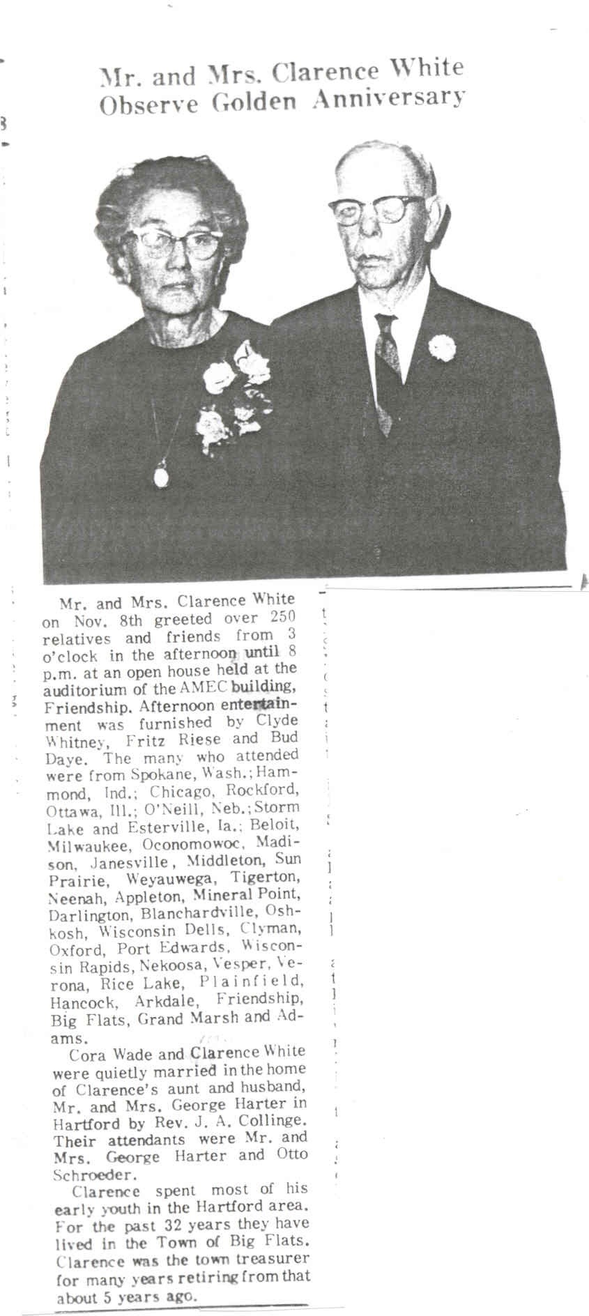 Source & Description: Contributed by Sally Traver from her husband's grandmother's (Ethel Viola Burr) scrapbook from an unknown newspaper, possibly the Adams/Friendship paper. Mrs. White was the former Cora Wade, and Clarence held the position of Big Flats town treasurer for a number of years.