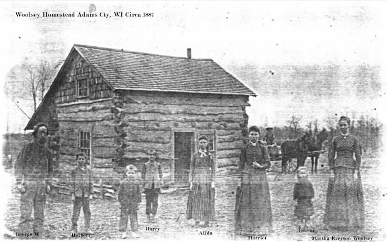 Adams Wisconsin circa 1887Source & Description: Jackie Cairns' gr gr grandfather, George Woolsey and family at the Woolsey homestead, Easton, Adams Cty, WI. George Washington Woolsey is on the far left.