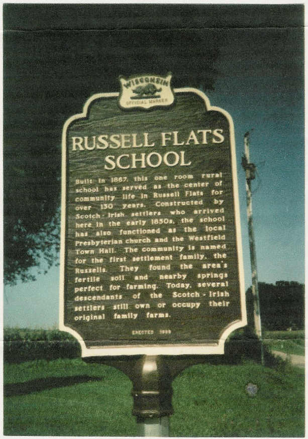 RUSSELL FLATS SCHOOL Photo of the Russell Flats Marker Location: corner of Ember Ave and 4th Ave, Westfield Erected: 1999 Contributed by: Roberta Johnson Built in 1867, this one room rural school has served as the center of community life in Russell Flats for over 130 years. Constructed by Scots-Irish settlers who arrived here in the early 1850's, the school has functioned as the local Presbyterian church and the Westfield Town Hall. The community is named for the first settlement family, the Russell's. They found the area's fertile soil and nearby springs perfect for farming. Today, several descendants of the Scotch-Irish settlers still own or occupy their original family farms. --contributed by Roberta Johnson, member of the Russell Flats historical marker committeeTranscribed by Joan Benner for the Marquette County WI Rootsweb Pages