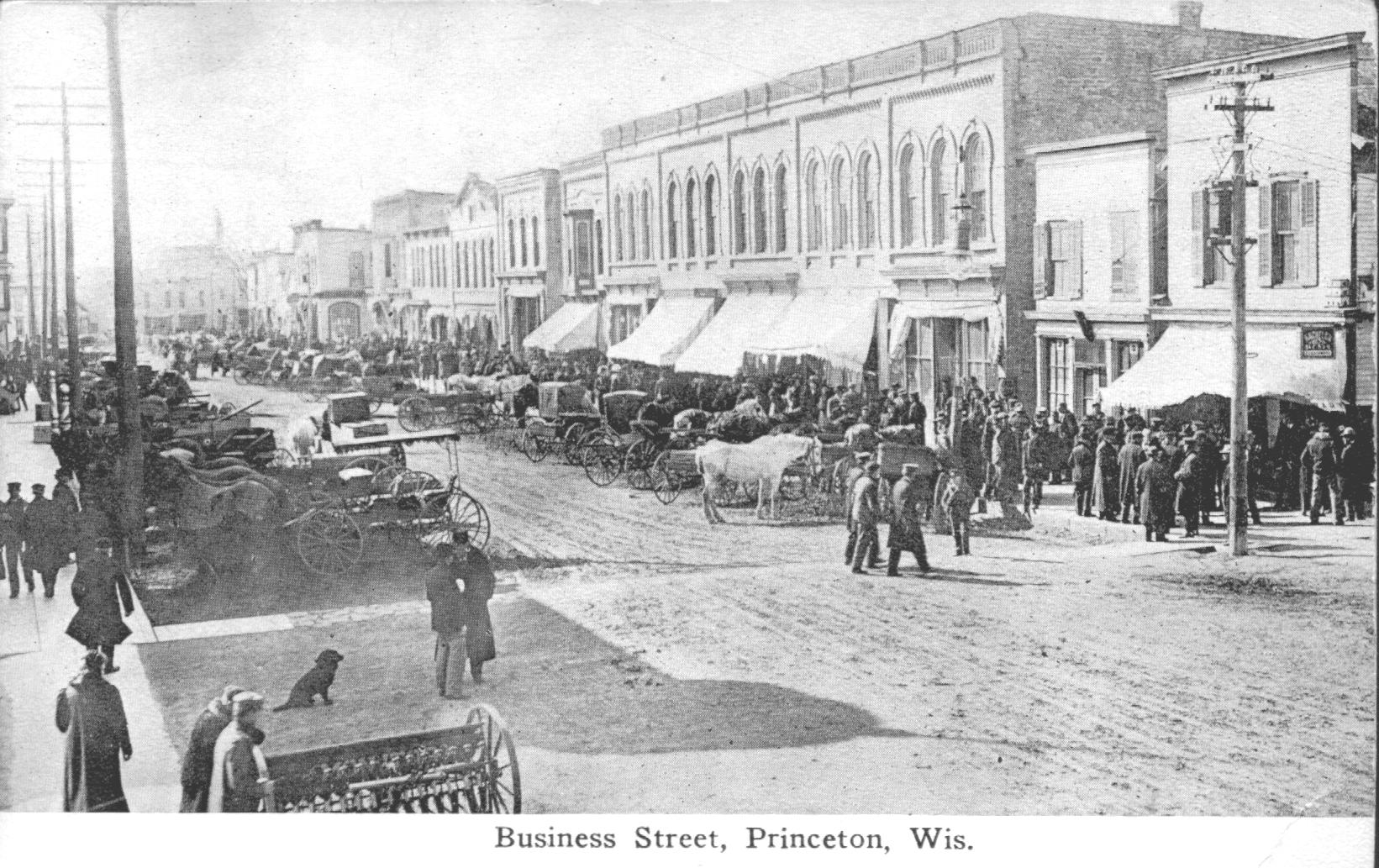 Business Street in Princeton, Wisconsin. An old postcard image contributed by Jean B, December 2002