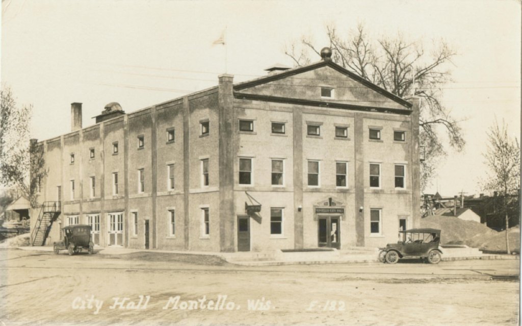 Montello WI City Hall, from an old postcard. Sent by L. John Ribar, added January 2003