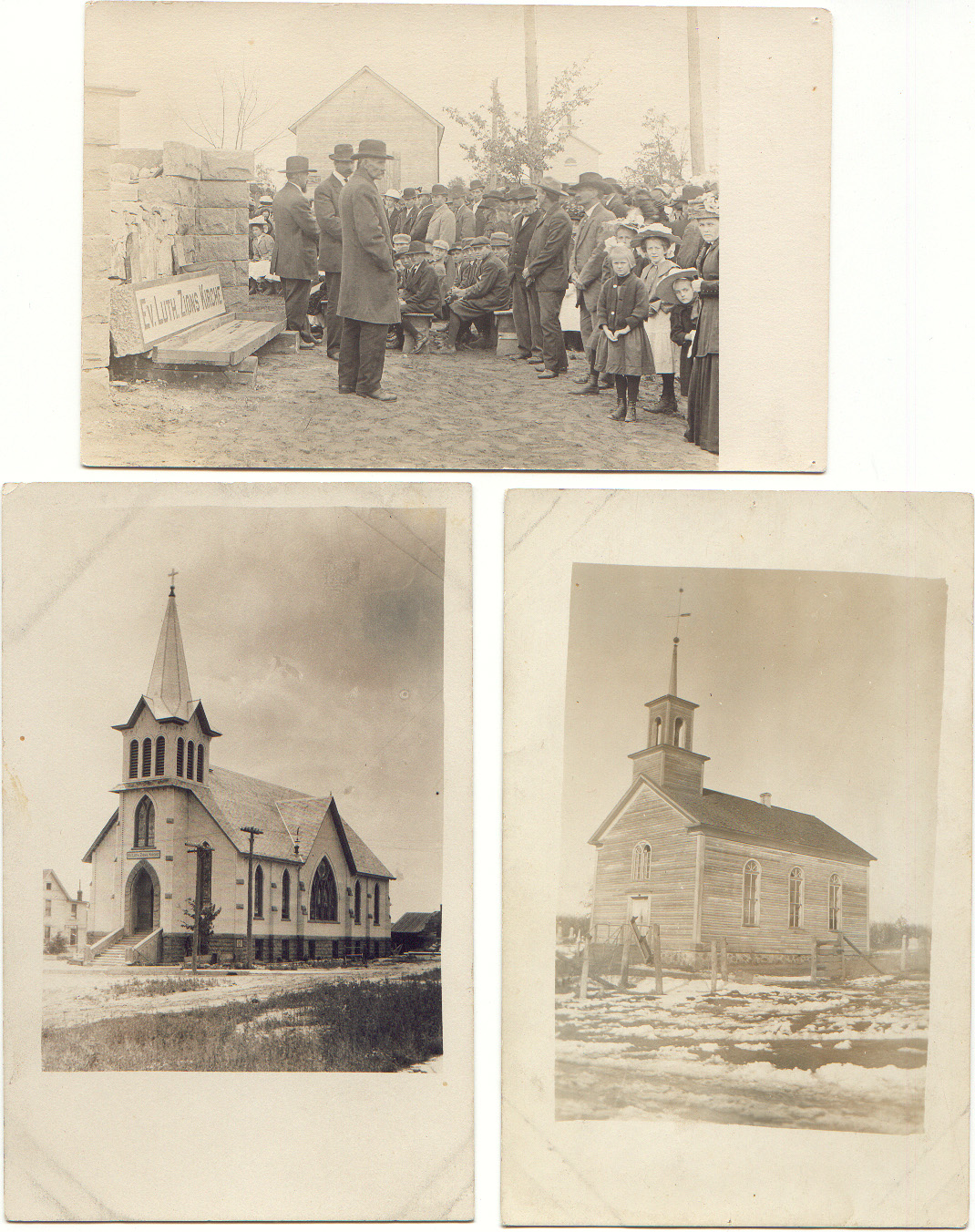 Zion Lutheran Church at Neshkoro. Two of the photos are also in the 75th Anniversary pamphlet published in 1956. The following information is from that pamphlet. The original wood frame church was constructed in 1881 on land donated by Christoph Dahlke on what is now the "old" cemetery east of highway 73. On Sept 21, 1912 the cornerstone was laid in the present day church and the original was torn down.