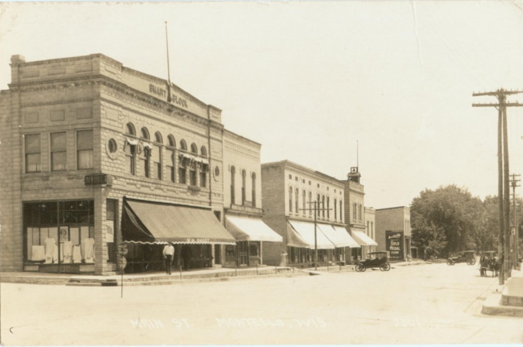 Montello WI Main Street, from an old postcard. Sent by L. John Ribar, added January 2003