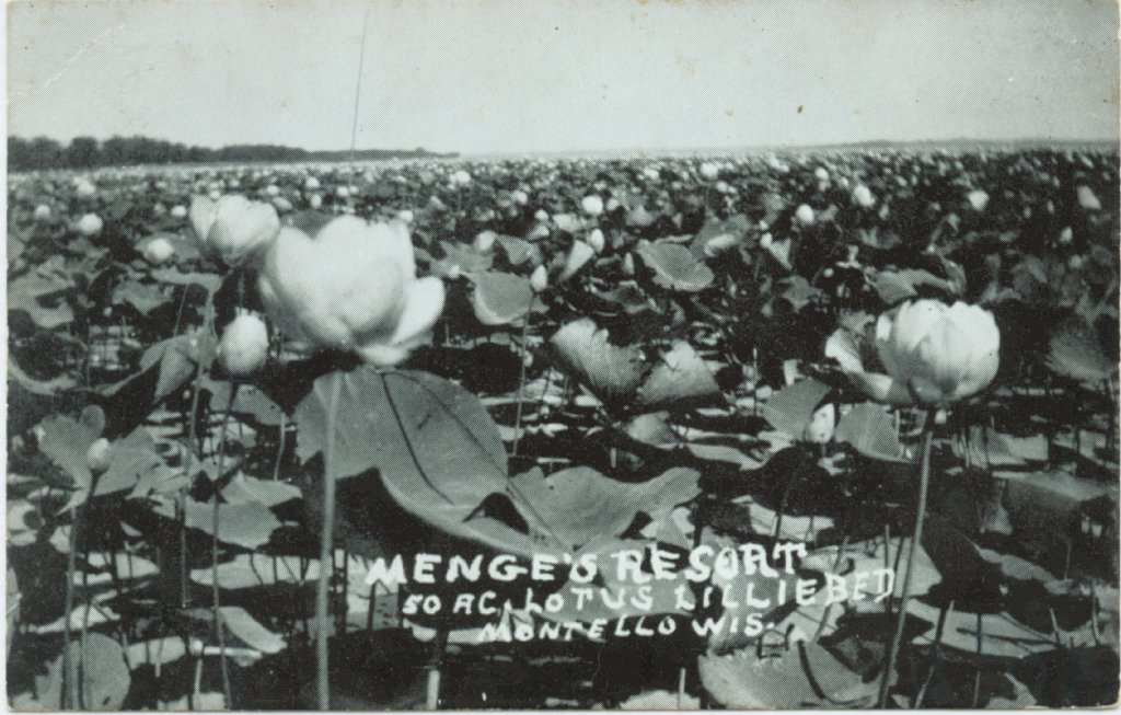 Montello WI another view of Menge's Resort, from an old postcard, and Water Lilies at the Resort in Bloom. Sent by L. John Ribar, added January 2003
